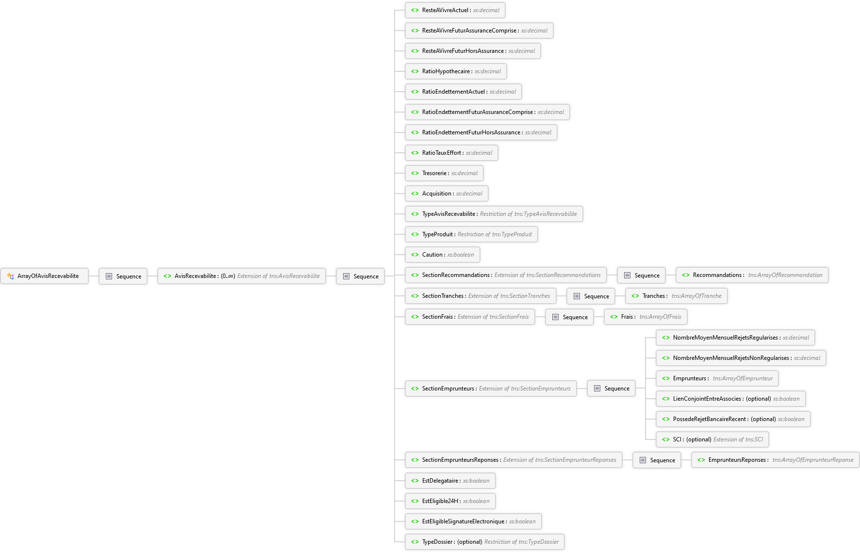 TypeDossier Élément EstEligibleSignatureElectronique Élément EstEligible24H Élément EstDelegataire Élément EmprunteursReponses Élément Sequence SectionEmprunteursReponses Élément SCI Élément PossedeRejetBancaireRecent Élément LienConjointEntreAssocies Élément Emprunteurs Élément NombreMoyenMensuelRejetsNonRegularises Élément NombreMoyenMensuelRejetsRegularises Élément Sequence SectionEmprunteurs Élément Frais Élément Sequence SectionFrais Élément Tranches Élément Sequence SectionTranches Élément Recommandations Élément Sequence SectionRecommandations Élément Caution Élément TypeProduit Élément TypeAvisRecevabilite Élément Acquisition Élément Tresorerie Élément RatioTauxEffort Élément RatioEndettementFuturHorsAssurance Élément RatioEndettementFuturAssuranceComprise Élément RatioEndettementActuel Élément RatioHypothecaire Élément ResteAVivreFuturHorsAssurance Élément ResteAVivreFuturAssuranceComprise Élément ResteAVivreActuel Élément Sequence AvisRecevabilite Élément Sequence ArrayOfAvisRecevabilite Complex Type