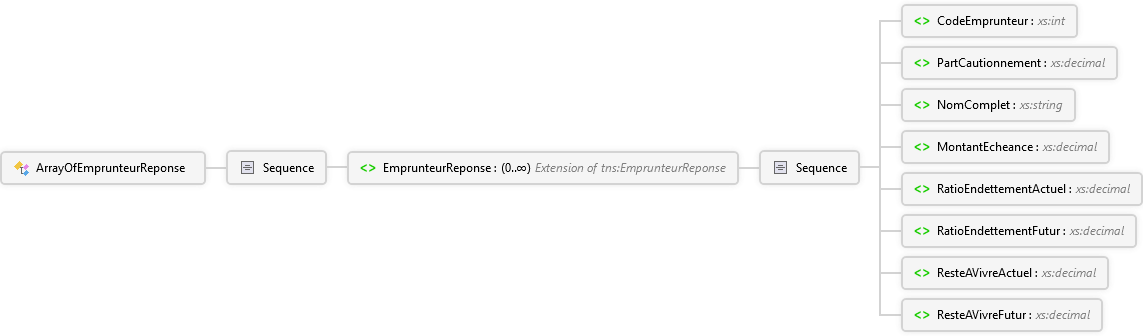 ResteAVivreFutur Élément ResteAVivreActuel Élément RatioEndettementFutur Élément RatioEndettementActuel Élément MontantEcheance Élément NomComplet Élément PartCautionnement Élément CodeEmprunteur Élément Sequence EmprunteurReponse Élément Sequence ArrayOfEmprunteurReponse Complex Type