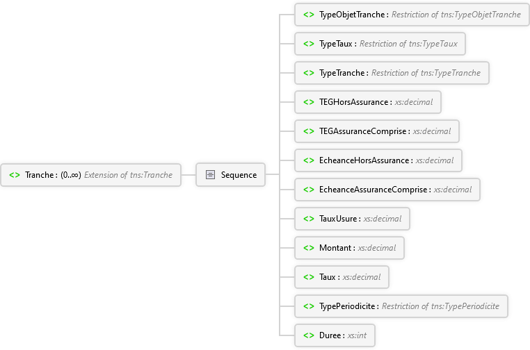 Duree Élément TypePeriodicite Élément Taux Élément Montant Élément TauxUsure Élément EcheanceAssuranceComprise Élément EcheanceHorsAssurance Élément TEGAssuranceComprise Élément TEGHorsAssurance Élément TypeTranche Élément TypeTaux Élément TypeObjetTranche Élément Sequence Tranche Élément