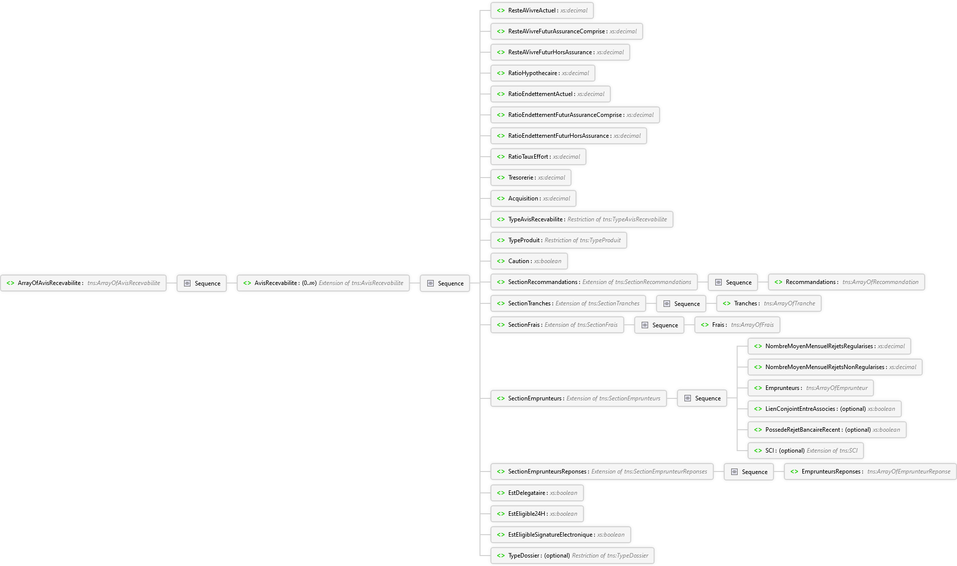 TypeDossier Élément EstEligibleSignatureElectronique Élément EstEligible24H Élément EstDelegataire Élément EmprunteursReponses Élément Sequence SectionEmprunteursReponses Élément SCI Élément PossedeRejetBancaireRecent Élément LienConjointEntreAssocies Élément Emprunteurs Élément NombreMoyenMensuelRejetsNonRegularises Élément NombreMoyenMensuelRejetsRegularises Élément Sequence SectionEmprunteurs Élément Frais Élément Sequence SectionFrais Élément Tranches Élément Sequence SectionTranches Élément Recommandations Élément Sequence SectionRecommandations Élément Caution Élément TypeProduit Élément TypeAvisRecevabilite Élément Acquisition Élément Tresorerie Élément RatioTauxEffort Élément RatioEndettementFuturHorsAssurance Élément RatioEndettementFuturAssuranceComprise Élément RatioEndettementActuel Élément RatioHypothecaire Élément ResteAVivreFuturHorsAssurance Élément ResteAVivreFuturAssuranceComprise Élément ResteAVivreActuel Élément Sequence AvisRecevabilite Élément Sequence ArrayOfAvisRecevabilite Élément