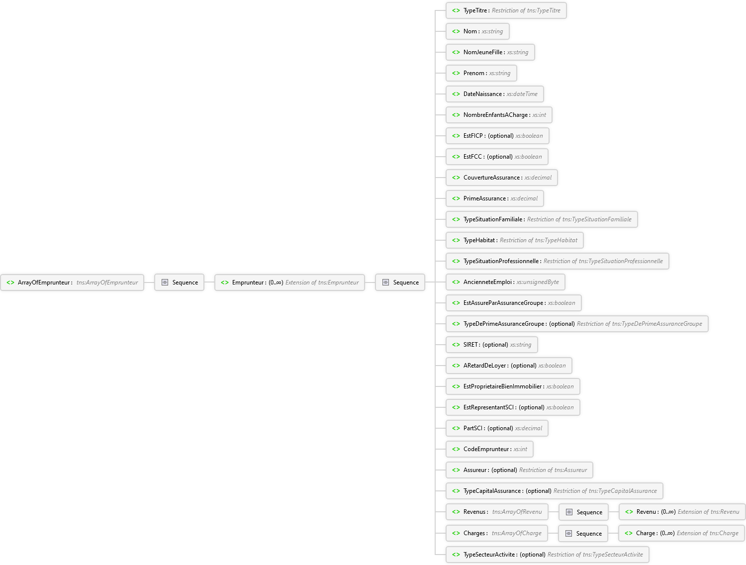 TypeSecteurActivite Élément Charge Élément Sequence Charges Élément Revenu Élément Sequence Revenus Élément TypeCapitalAssurance Élément Assureur Élément CodeEmprunteur Élément PartSCI Élément EstRepresentantSCI Élément EstProprietaireBienImmobilier Élément ARetardDeLoyer Élément SIRET Élément TypeDePrimeAssuranceGroupe Élément EstAssureParAssuranceGroupe Élément AncienneteEmploi Élément TypeSituationProfessionnelle Élément TypeHabitat Élément TypeSituationFamiliale Élément PrimeAssurance Élément CouvertureAssurance Élément EstFCC Élément EstFICP Élément NombreEnfantsACharge Élément DateNaissance Élément Prenom Élément NomJeuneFille Élément Nom Élément TypeTitre Élément Sequence Emprunteur Élément Sequence ArrayOfEmprunteur Élément