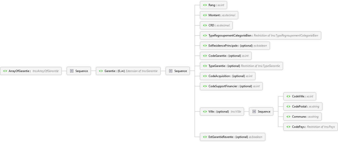 EstGarantieRevente Élément CodePays Élément Commune Élément CodePostal Élément CodeVille Élément Sequence Ville Élément CodeSupportFinancier Élément CodeAcquisition Élément TypeGarantie Élément CodeGarantie Élément EstResidencePrincipale Élément TypeRegroupementCategorieBien Élément CRD Élément Montant Élément Rang Élément Sequence Garantie Élément Sequence ArrayOfGarantie Élément