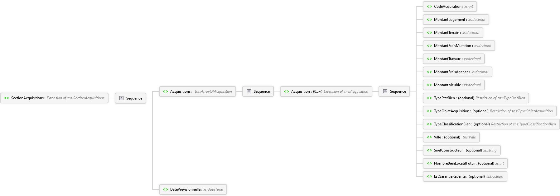 DatePrevisionnelle Élément EstGarantieRevente Élément NombreBienLocatifFutur Élément SiretConstructeur Élément Ville Élément TypeClassificationBien Élément TypeObjetAcquisition Élément TypeEtatBien Élément MontantMeuble Élément MontantFraisAgence Élément MontantTravaux Élément MontantFraisMutation Élément MontantTerrain Élément MontantLogement Élément CodeAcquisition Élément Sequence Acquisition Élément Sequence Acquisitions Élément Sequence SectionAcquisitions Élément
