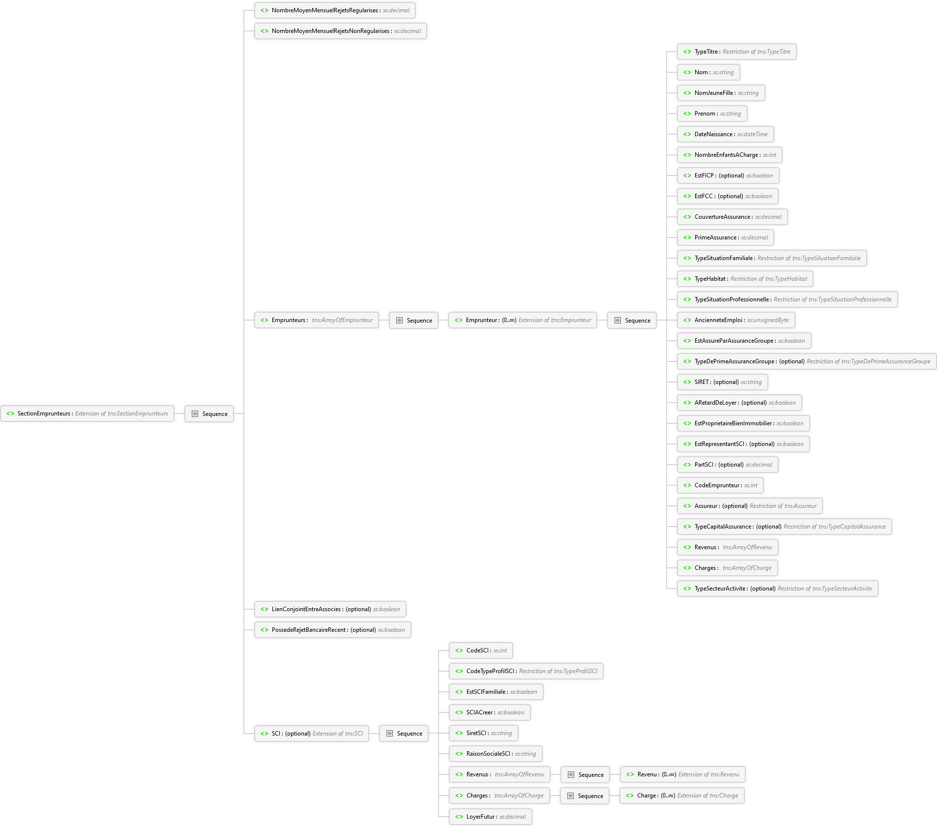 LoyerFutur Élément Charge Élément Sequence Charges Élément Revenu Élément Sequence Revenus Élément RaisonSocialeSCI Élément SiretSCI Élément SCIACreer Élément EstSCIFamiliale Élément CodeTypeProfilSCI Élément CodeSCI Élément Sequence SCI Élément PossedeRejetBancaireRecent Élément LienConjointEntreAssocies Élément TypeSecteurActivite Élément Charges Élément Revenus Élément TypeCapitalAssurance Élément Assureur Élément CodeEmprunteur Élément PartSCI Élément EstRepresentantSCI Élément EstProprietaireBienImmobilier Élément ARetardDeLoyer Élément SIRET Élément TypeDePrimeAssuranceGroupe Élément EstAssureParAssuranceGroupe Élément AncienneteEmploi Élément TypeSituationProfessionnelle Élément TypeHabitat Élément TypeSituationFamiliale Élément PrimeAssurance Élément CouvertureAssurance Élément EstFCC Élément EstFICP Élément NombreEnfantsACharge Élément DateNaissance Élément Prenom Élément NomJeuneFille Élément Nom Élément TypeTitre Élément Sequence Emprunteur Élément Sequence Emprunteurs Élément NombreMoyenMensuelRejetsNonRegularises Élément NombreMoyenMensuelRejetsRegularises Élément Sequence SectionEmprunteurs Élément