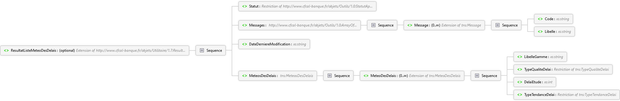 <xs:element minOccurs="0" name="ResultatListeMeteoDesDelais" nillable="true" type="q13:ResultatListeMeteoDesDelais" xmlns:q13="http://www.cfcal-banque.fr/objets/Utilitaire/1.7" xmlns:xs="http://www.w3.org/2001/XMLSchema">
